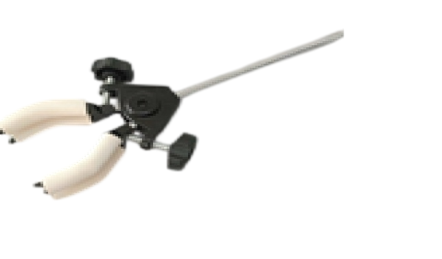 Это лабораторный зажим, также известный как ретортический зажим или зажим для штатива, используемый в научных исследованиях. Он используется для надежного крепления лабораторных принадлежностей, таких как стаканы, колбы или бюретки, во время экспериментов или измерений. Зажим имеет четыре «пальца» с белыми нескользящими накладками, обеспечивающими надежный захват и защиту удерживаемого объекта. Он оснащен регулировочными ручками для управления шириной губок и углом наклона зажимной головки