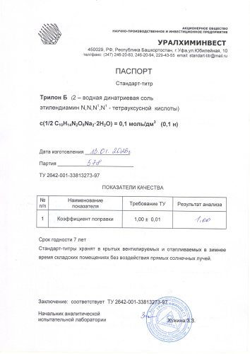 Стандарт-титр Трилон Б 0,1н (2-водная динатриевая соль этилендиамин N,N,N1,N1 - тетрауксусной кислоты, комплексон III , ЭДТА) 1/2 С10H14N2O8Na2 * 2H2O - используется для титриметрического анализа. В ходе такого исследования готовится стандартный раствор с известной концентрацией. Получают его путем растворения содержимого ампулы в мерной колбе с дистиллированной водой. ТУ 2642-001-33813273-97